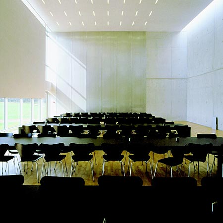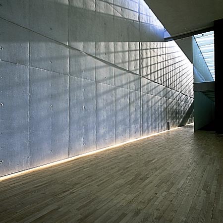 The resulting expression is almost organic, like a fabric attached to a light frame, and gives the in-stu cast wall a light, soft quality. The light falling from above pronoun-ces the minor surface variations and enhances the effect.