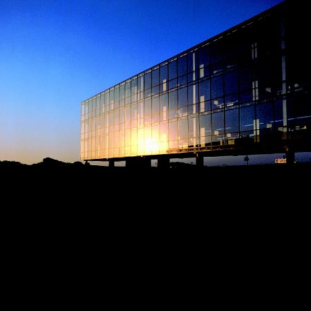 The building is a floating, semi-transparent, rectangular shape, a balance between lightness and heaviness.