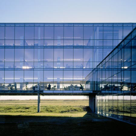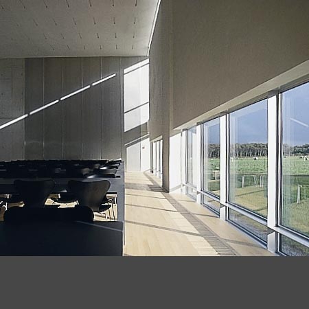 The large glass surfaces both reflect and transmit light and the impression of the surrounding landscape.
