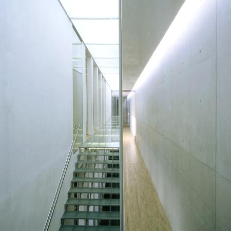 Coming from above, the light is reflected from the white concrete surface, resulting in the pleasantly warm hue of the light in the hallway and staircases.
