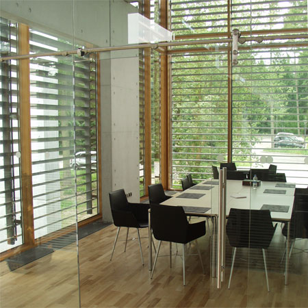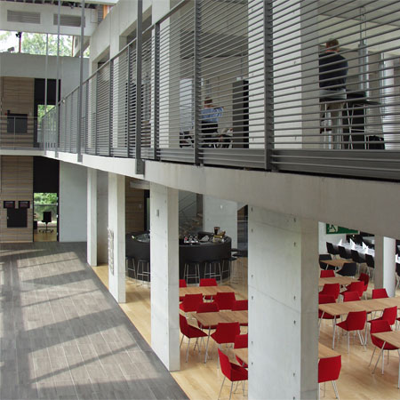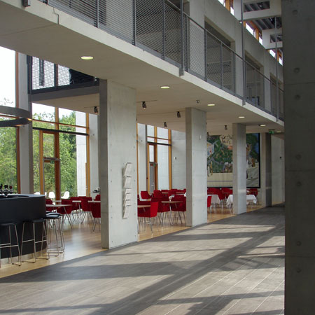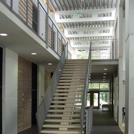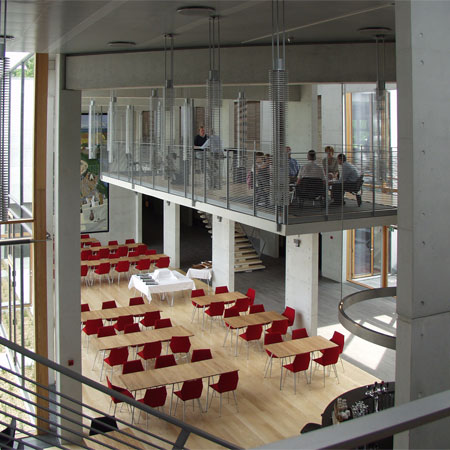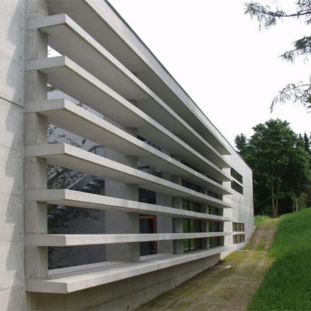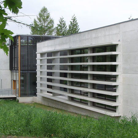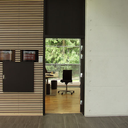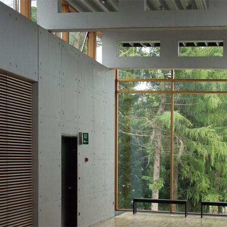 In harmony with nature CUBO Arkitekter A/S has, in a magnificent way, thought through and designed a building that blends with the immediate landscape - the small lake, the trees and the terrain. When you approach the building, walk around it and use the building, you experience that the boundary between the outdoor and indoor is erased and that you experience a sensation that nature is drawn into the building.
