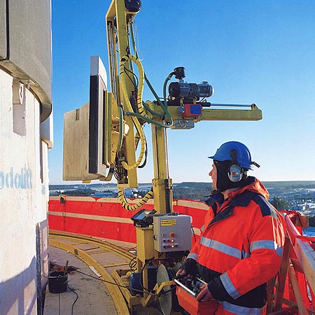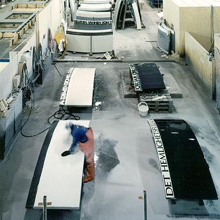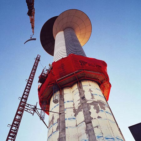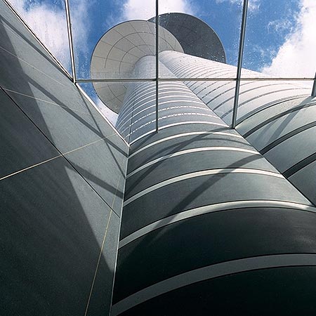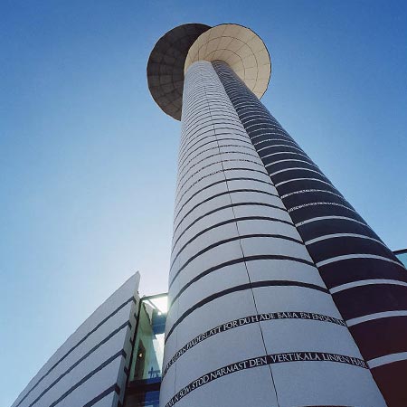 Adding to the sculptural impression, several of the pre-cast elements cladding the stem are inlaid with letters forming sentences from the novel "Mail Plane South" by Antoine de Saint-Exupérus from 1928.