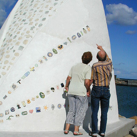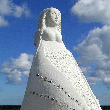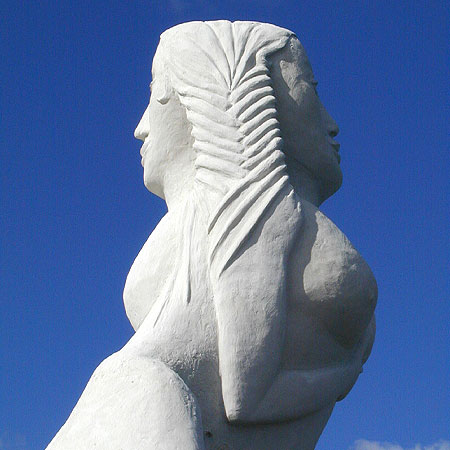 The sculpture is a double-sided Janus figure, a mythological creature with two faces that symbolise beginning and ending, past and future, departure and homecoming at the same time. Voyagers coming in from the sea meet the open, extroverted side of the figure while the introverted, contemplative side faces the harbour and the land.