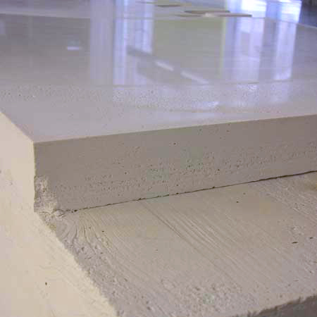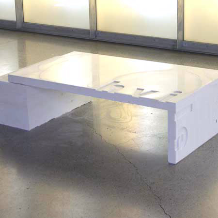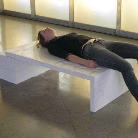 The bench has two components. One is the surface on which you can lie and the other is the more massive structure on which this surface rests. This reflects the concept behind the bench of something light supported by something heavy. The reclined body lies on a surface which is as smooth as glass. It is actually a 6 mm thick glass sheet which is used as formwork. This creates a sharp interface where the two surfaces meet.