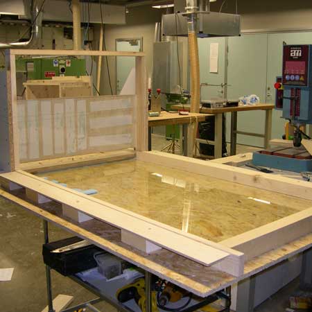 The bench is only 50 mm thick, but has a span of 1,200 mm. There are, inside, two layers of welded steel which forms a 3 mm untreated steel lattice of mesh size 30 mm.